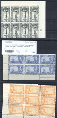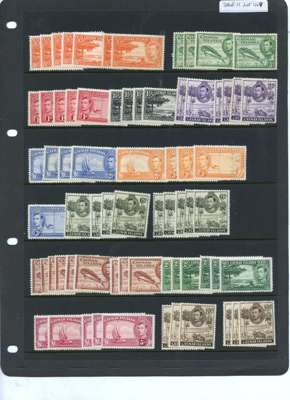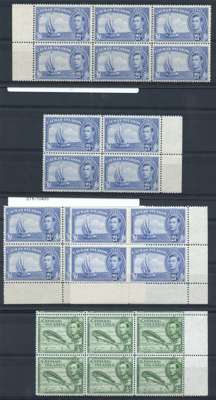 1938-48 definitive range on stocksheet and on dealer's cards. An accumulation of the 1938 set (70 stamps), collected for printings with 1/- (9), 2/- yellow-green (3), 2/- green (3), 5/- carmine-lake (2), crimson (3) and 10/- (6); and seven multiples (one on the Victory issue) showing re-entries and flaws. SG 115-126a