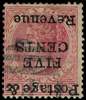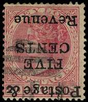 1885 5c on 4c rose, watermark Crown CA. Used example with surcharge inverted, a couple of shortish perfs at top and slightly soiled, but a scarce stamp. SG 178a, £350