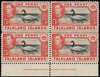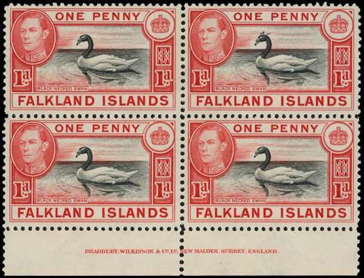 1938 1d black and carmine imprint block of four with the top right stamp (R9/4) showing ‘swan with horns’ variety, quite prominent. Large part o.g., slightly two-toned. Unusual and rather attractive. SG 147, £140