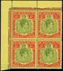 1949 (Dec) 5/- green and pale yellow perf 13, o.g. top left corner block of four, unmounted o.g. Multiple plate varieties including HPFs #2a joined pearls, 14a scratched scrolls. SG 118f, £140