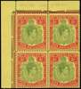 1949 (Dec) 5/- green and pale yellow perf 13, o.g. top left corner block of four, hinged on the selvedge only with the stamps unmounted. Multiple plate varieties including HPFs #2a joined pearls, 14a scratched scrolls. SG 118f, £140