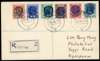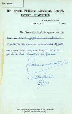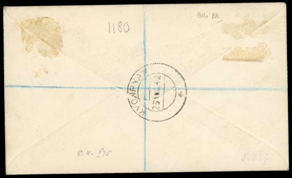 1942 local registered Lim Peng Hong cover with Henzada Type 5 Peacocks; 1p, 6p, 1a, 1½a, 2a and 4a, the 1½a with position 8 ‘pin’ flaw, tied by Kyonpyaw CDSs of 25 AUG. Rare, especially with the 1p value. BPA Certificate (1960). SG J25, 27, 29, 30-2