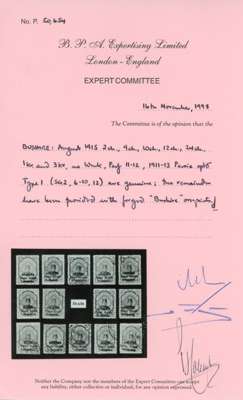 1915 issue mint and used selection in an envelope with settings and positions identified. Mint values include 1ch, 2ch, 9ch, 12ch, 24ch, and used includes: 6ch (2, one on cover), 10ch, 1kr, 2kr, 3kr (2). Condition mainly good to fine. Offered with pink BPA cert (1998) certifying SG 2, 6-10, and 12 as genuine. SG 1/12, £3,025.