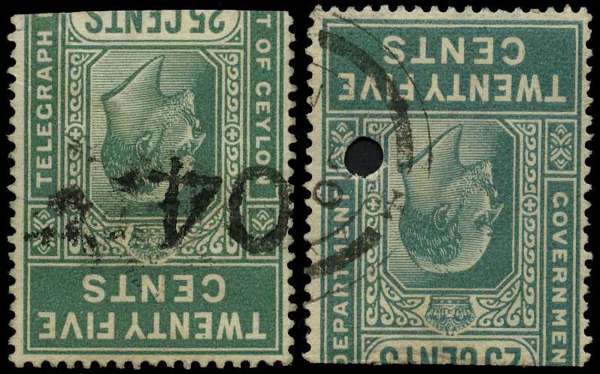 1904 25ct green with inverted watermark, upper half with part 04 date cancel and a very scarce lower half with punched hole and part CDS. SG T154w