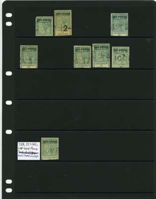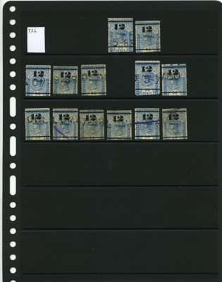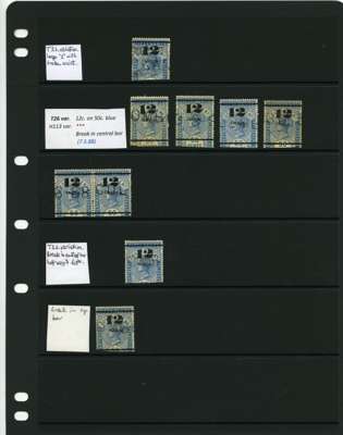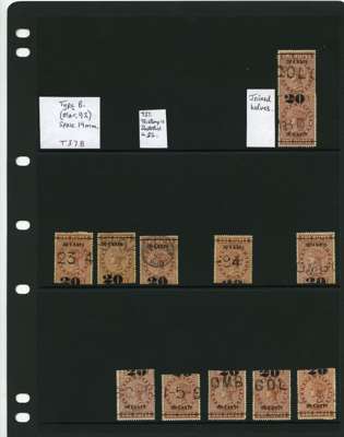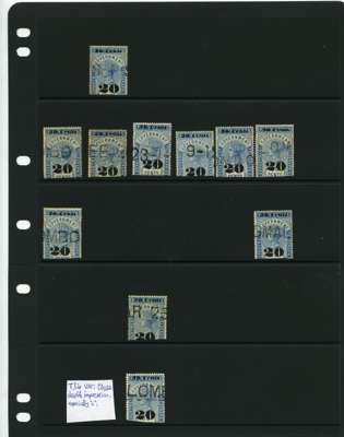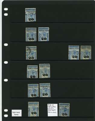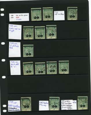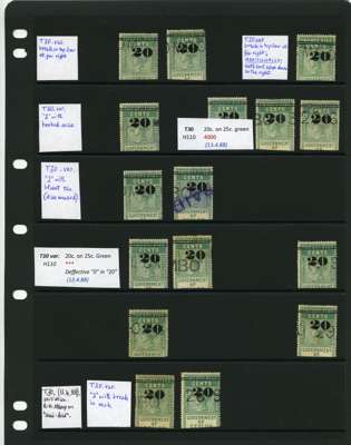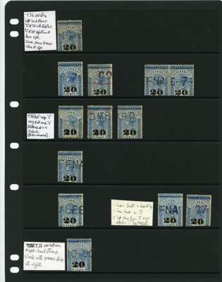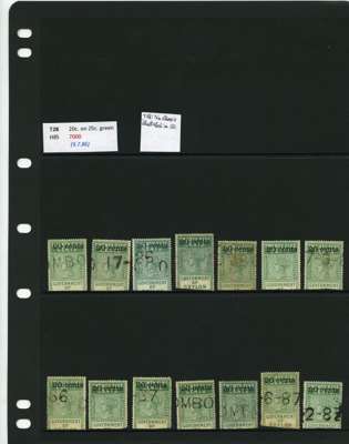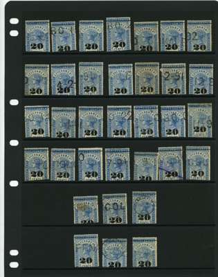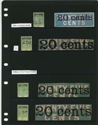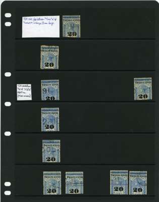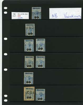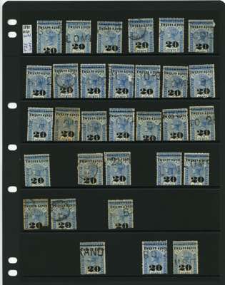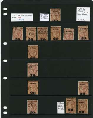 1886-92 12ct on 50ct (SG T26) and range of 20ct surcharges (SG T28-30, 34-7) used study groups, with lots of type varieties including SG T28 with a close second impression of the surcharge which we do not feel constitutes a true double impression. A very useful range for the specialist