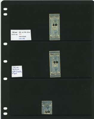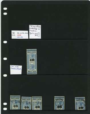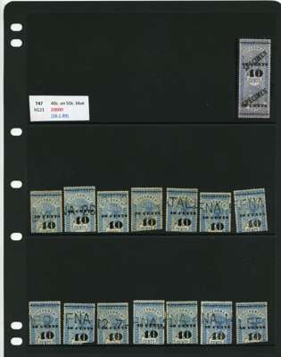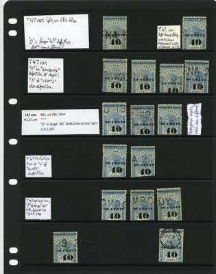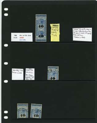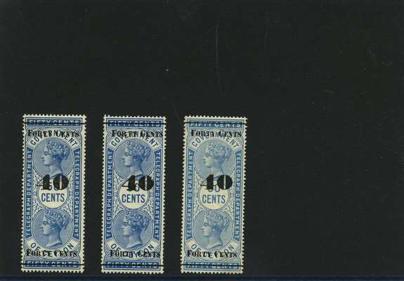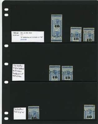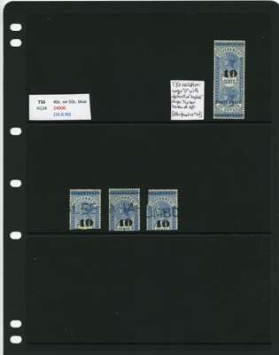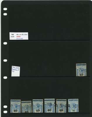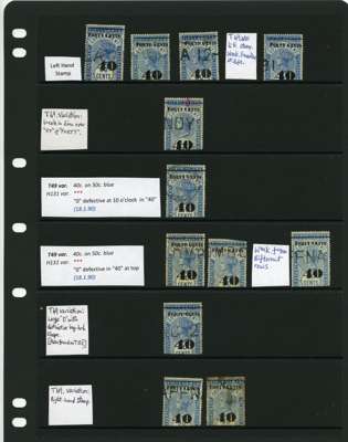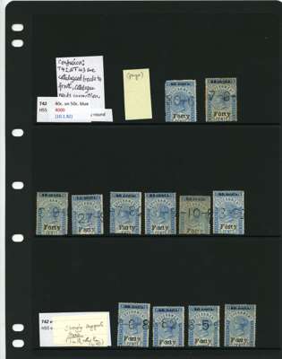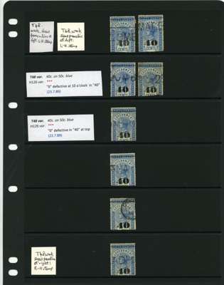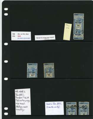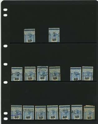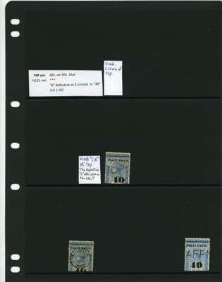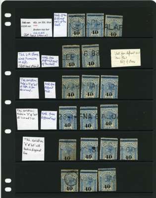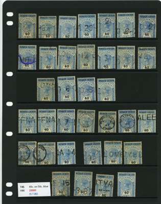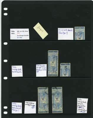 1881-90 40ct black surcharges group with SG T41 used (4), T42 (16 plus a whole stamp with faults), T45 three whole stamps and two top halves each with some measure of very close surcharge doubling, plus 35 'ordinary' examples, T46 40 examples, T47 x 44, T48 o.g. and 51 used the latter including T50, T49 four o.g., one with a bend and 54 used, T50 two o.g. and nine used allocated here by the vendor