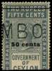 1882 50ct on 2r50 grey surcharge Type 55, used with part Colombo cancel, fine. Very scarce, with just 400 printed. SG T60