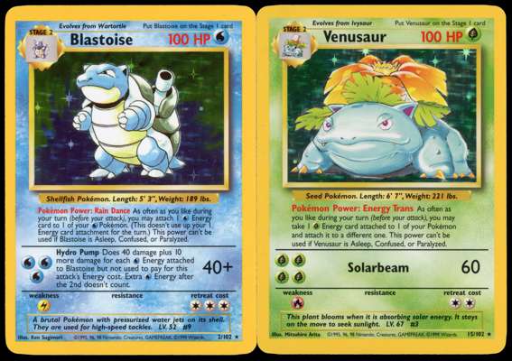 This lot contains two of the most iconic cards from the Base Set, the holo Blastoise 2/102 and the holo Venusaur #15/102. Both cards are Unlimited and in near mint condition, they come from the vault of a former Wizards of the Coast employee tasked with making Pokémon cards! No Charizards in sight!
