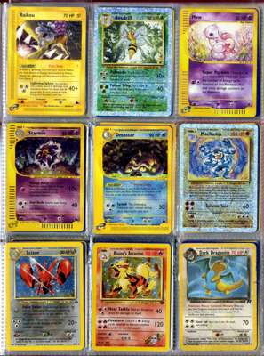 The cards in this collection range from near mint to poor but all cards come complete in a 9-pocket page binder. While this set contains roughly 55 Pokémon cards the dollar amount of just a fraction of these cards is well over $500. The Collection contains a number of high value Skyridge cards such as the holo Piloswine, holo Starmie, two non-holo gengars, a reverse holo Moltres and many more. A true treasure trove of a collection.
