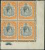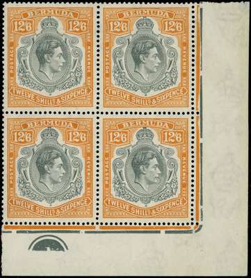 1937 (Nov) 12/6d deep grey and brownish orange lower right Plate block of four, fresh appearance, o.g. with three stamps unmounted, the gum streaky and toned as usual. Small selvedge thin. The top two stamps are pretty much severed, but this is still a rare Plate block from this printing, the majority of stamps in the deep shade emanating from the second printing, ex Dickgiesser. SG 120, £2500