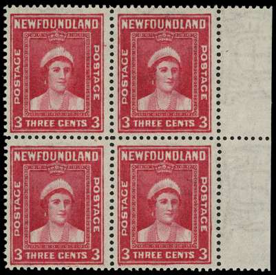 1941-4 Second Resources 3c carmine perf 12½ right-marginal block of four, unmounted o.g., printed double, one albino. Light natural gum bends. SG 278 var