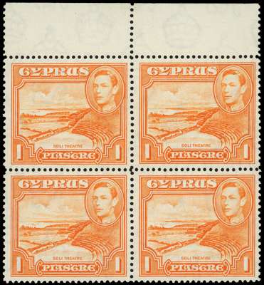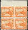 1944 1pi orange perf 13½ x 12½ top marginal block of four, unmounted o.g. Pristine and very scarce. SG 154a, £2200