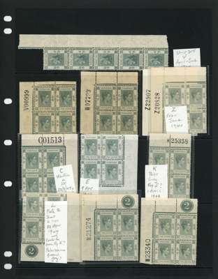 1938-52 2c specialised group, mint. Requisition blocks V (foxing), W, Z (2 plus a left pane), C, K, L (2, one on K printing), M (2) and P (2). Also further blocks ascribed to Reqs. V (strip), E, L and Z; and four further Plate blocks. SG 141, a