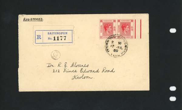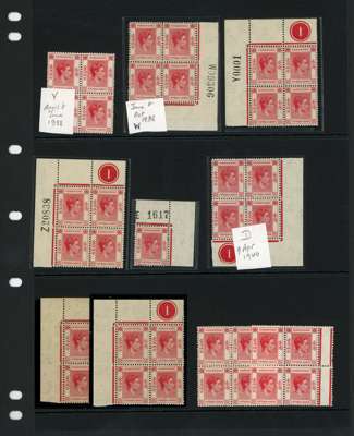 1938-52 15c specialised group. Requisition blocks W, Y (sheet number 0001), Z and single of E; and blocks ascribed to V and D. Also two further Plate blocks and R6/6 broken characters blocks, one State 2, the other showing the repair, and a pair used on local registered envelope from Sai Ying Pun. SG 146, a