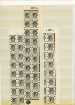 1946-52 20c specialised range mint. Black blocks with Requisition D (block of 20), E (3, one a block of 48) and single) and three further blocks, two Plate blocks. Scarlet-vermilion and rose-red blocks with Requisitions H (3), K (2), M (2), P, R and S; five further blocks, two being Plate blocks of the rose-red shade. SG 147, 148, a