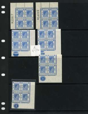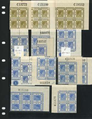 1945-52 30c specialised group, mint. 30c yellowish olive, perf 14½ x 14 three Requisition C blocks (one a block of eight); 30c blue blocks with Requisition ( plus single), H (2, different printings), K (2), M (2) and R (2). Also blocks ascribed to Req. D, E, H and S (2)and two further Plate blocks. SG 151a, 152