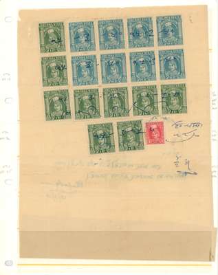1939-42 1a, 1r strip of four, two pairs and a single and 10r block of six and a pair, used on document with pen cancels; the document folded (some reinforcement) and creased, some foxing affecting perfs in places, the 10r usage striking and rare. SG 34, 42, 45