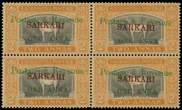 Officials. 1950 1a on 2a grey and dull yellow block of four, large part o.g., toned. The upper right stamp with stop after ANNA omitted. SG O22, £600
