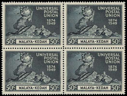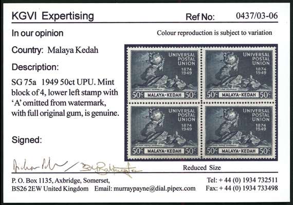 1949 UPU 50c block of four, unmounted o.g., lower left stamp with ‘A’ of CA in watermark omitted. KG VI Expertising Certificate (2006). SG 75a, £1000