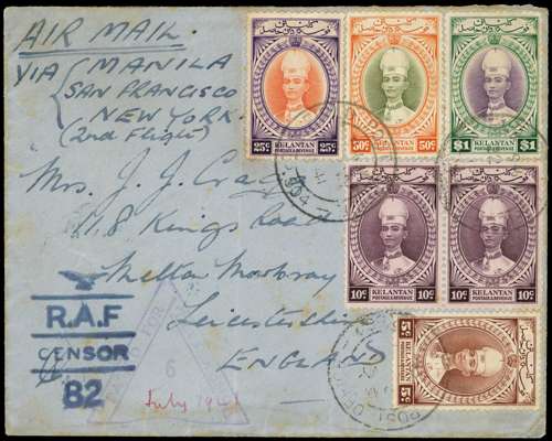 1941 envelope to England bearing 1937 5c, 10c pair, 25c, 50c and $1 cancelled by FPO SP 04 CDSs. Violet triangular Censor 6 and RAF Censor 82 on front, carried on California Clipper route via Manila, San Francisco and New York. The envelope creased and with light staining. Ex Dr Cheah and Stolz