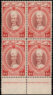 1940 $2 red-brown and scarlet imprint block of four, unmounted o.g. Light discolouration down the left side on the reverse, still fine and a rare multiple. SG 53, £2000