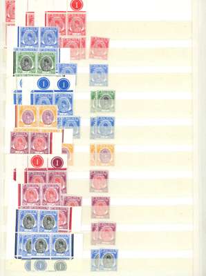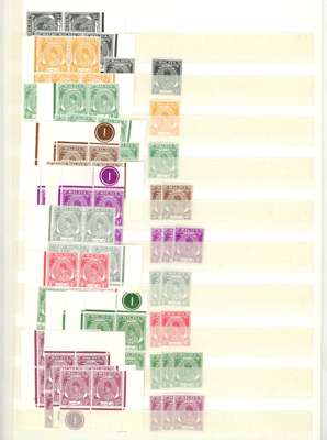 1949-55 set on two stockbook pages, an accumulation with eight unmounted sets (save only five 30c) including blocks of four, some with Plate numbers, Plate number pairs. At least one extra of most, also a hinged set with extras, and five stamps with printing dates allocated. SG 7-27