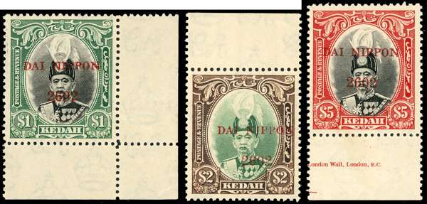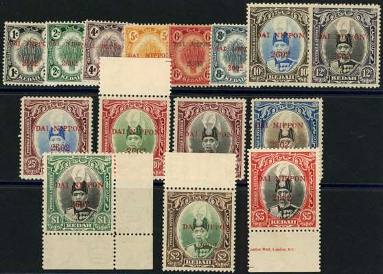 1943 Kedah set of fifteen with DAI NIPPON 2602 overprints in red (save the 6c, which is toned as often, in black). Fine o.g. with the 1c, 4c and 50c hinged, otherwise unmounted; 2c with a small toned patch on reverse, SG J1-15, £700