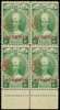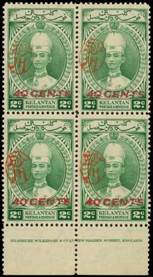 1942 Sunagawa Seal on Kelantan 40c on 2c green imprint block of four, mint. Lightly browned o.g., unmounted with traces of pink adhesion. Scarce multiple. SG J26, £340