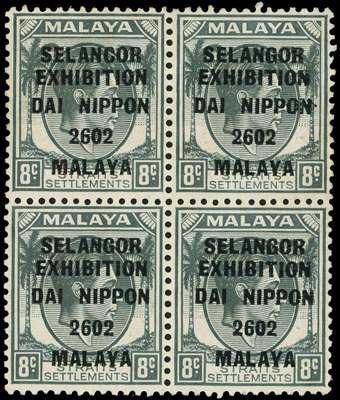 1942 Straits 8c grey with Selangor Exhibition overprint block of four with R1/9 SELANCOR error, fine unmounted o.g. BPA Certificate (1999). SG J91, a, £548