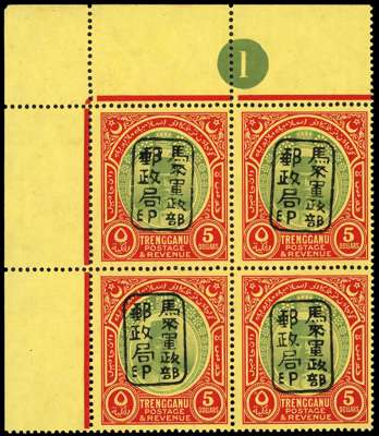 1942 Trengganu $5 green and red on yellow paper top left corner block of four with Plate 1, Chop E in black, o.g., lightly hinged on the selvedge only. Fine multiple. SG J115, £1600