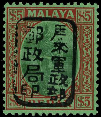 1942 Perak $5 green and red on emerald paper with Chop M, unmounted o.g. BPA Certificate (1997). SG J205, £750
