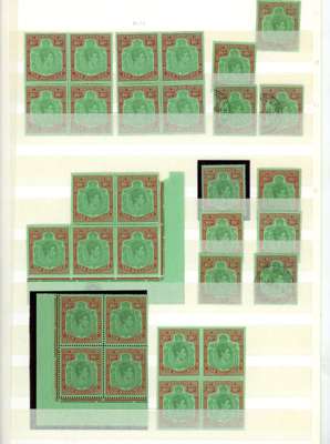1941-6 balance group on stocksheet with single line perf example with HPF #49, used, late CTO; 3.43 printing with two blocks of four, one unmounted with HPF #49; 1944 printing with Plate block of five, some faults on reverse, two unmounted blocks, one with HPF #49, five mint singles and one used; 1946 printing with two blocks, one unmounted, two mint singles and one used. SG 119c, d