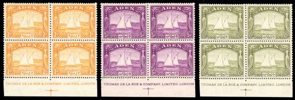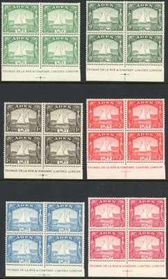 1937 Dhow set of twelve in De La Rue imprint blocks of four, unmounted o.g., very fine. SG 1-12, £4800