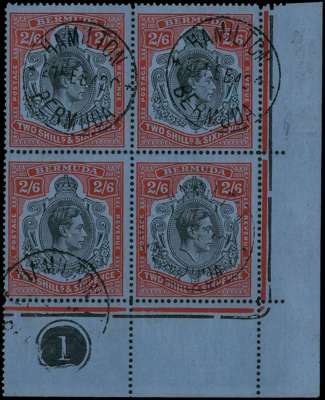 1941 (May) 2/6d line perf block of four, HPF #59 broken upper right scroll and 60 broken lower right scroll, fine used with Hamilton CDSs of 21 FEB 42. Rare multiple. SG 117a, ad, ae, £2440