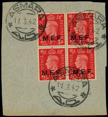 1942 Nairobi 1d round and square stops block of four on piece, Asmara A.D. CDSs (Type AE20) of 11.3. 42. Fine. SG M6b, £320