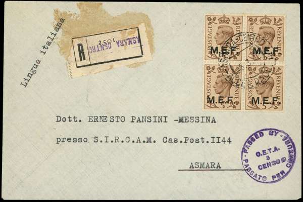 1942 Nairobi 5d round and square stops block of two vertical se-tenant pairs on local registered envelope, Asmara Centro registered label and central CDS on the stamps (6.3.42). Censor strike in purple. Brandon Certificate (1999), a rare used multiple. Ex Rossi. SG M10b, £2000 as two se-tenant pairs