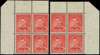 1937-8 2d scarlet perf 13½ x 14 upper left corner block of four with Plate 1, and upper right block of four also with Plate 1, each o.g., hinged on the selvedge only. SG 167, ASC 187z, za, $1200