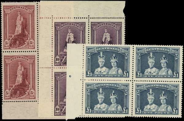 1948-9 5/-, 10/- and £1 Robes on thin paper o.g. marginal blocks of four, the stamps unmounted. Fine. SG 176a-178a, £586