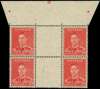 1938-41 2d scarlet perf 15 x 14 interpanneau block of four, showing part of Plate .8. at top. O.g., with several hinged areas on the selvedge and a light fold up the gutter. SG 184, ASC 188zg, $2000