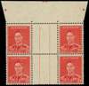 1938-41 2d scarlet perf 15 x 14 interpanneau block of four, showing a small part of Plate 20 at top. O.g., with several hinged areas on the selvedge and a light fold up the gutter, a very rare multiple. SG 184, ASC 188zoa, $3500