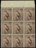 1942-56 6d purple-brown perf 15 x 14 top marginal block of nine, lower right stamp with R3/3 LRP ‘top hat’ flaw. O.g., lightly hinged on the selvedge only; folded between first and second columns, very faint staining in a couple of places but the variety is fine. SG 190ab, £2000