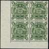 1953 £2 green lower left corner block of four without imprint, fresh unmounted o.g. SG 224d, ASC 271zd, $1750