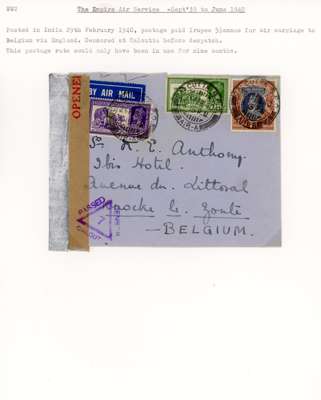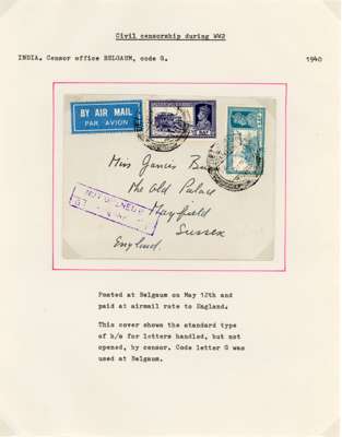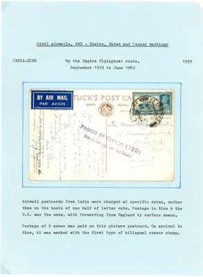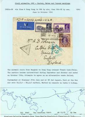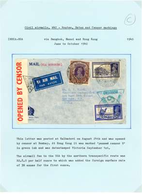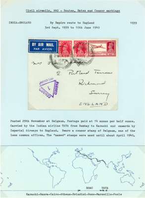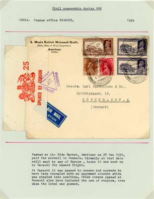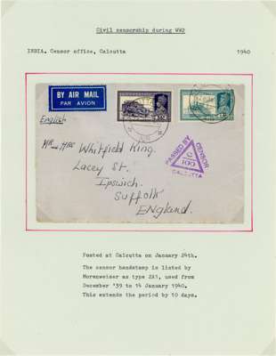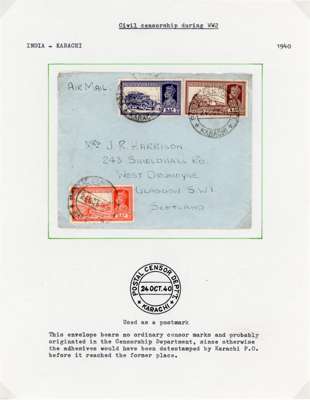 Postal History. 1939 envelopes and cards (11) to Europe and USA at various rates; censors include black Hong Kong label, scarce Calcutta ‘C/100’ triangle, and one with POSTAL CENSORSHIP KARACHI CDSs. Varied routes, all nice items from the early wartime period, ex Ian Warn