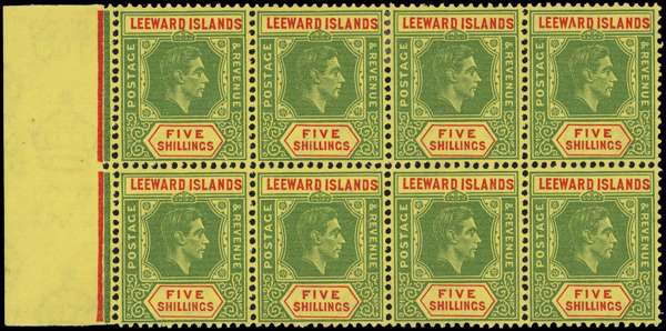 1943-4 5/- ordinary paper left marginal block of eight, R6/1 ‘Green’ flaw ('extra leaf' at lower right) and 6/4 broken ‘A’ in LEEWARD. Hinged on R6/2-3 only. A difficult multiple, ex Harold Green (the discoverer of the flaw). SG 112b var, £280