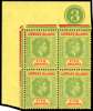 1951 5/- bright green and red on yellow paper upper left corner block of four with Plate no. 3, o.g., hinged on the lower pair and (extensively) on the selvedge. Lovely appearance, an exceedingly rare Plate block with a handful known. SG 112c