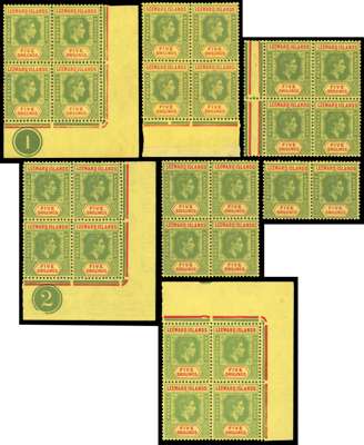 1938 5/- Plate 1 block from RP, R10/6 RP damaged top frame of value tablet, unmounted o.g.; another lower marginal block, unmounted, both with less gum browning than usual. 1943-4 marginal block of four, unmounted; Plate 2 block from RP, hinged on selvedge only, light natural bend; a further unmounted block, R9/3 LP strengthened rosette; unmounted pair, left stamp with R6/4 damaged ‘A’; 1951 unmounted top right corner block of four from RP, tall selvedge showing base of Plate plug. SG 112-c