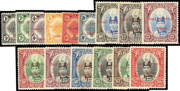 1942 Kedah set of fifteen overprinted DAI NIPPON 2602, large part o.g., the $1 and $2 with small discolorations on gum; still a good set. SG J1-15, £700