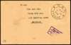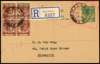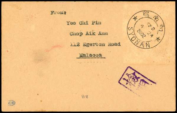 1942 2c registered stationery postcard with Malacca Chop, uprated with Straits 5c block of four with complete Chop, Malacca CDS 23 AP 1942. To Singapore with arrival CDS on reverse, and violet Censor Chop. Ex Rowell. SG J48