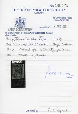 1941 Negri Sembilan $5 green and red on emerald paper with Chop D in red, large part o.g. Ex Tompkins, RPS Certificate (2001), a rare stamp. SG J175a, £2500