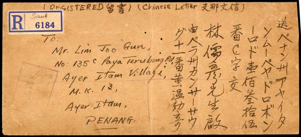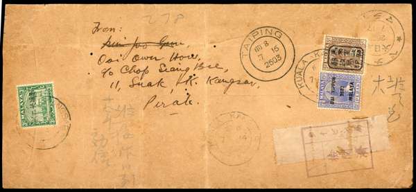 1943 (14 July) envelope (223 x 100mm, with letter) registered from Kuala Kangsar to Penang, bearing on reverse Perak 5c with black single-frame chop, 15c with Dai Nippon overprint and Selangor 3c with Kanji overprint, all tied by Kuala Kangsar CDSs. Taiping transit (16.7), censor chop and, on face, provisional registration label. The envelope with two vertical creases and some worm holes well clear of adhesives and markings. Rare